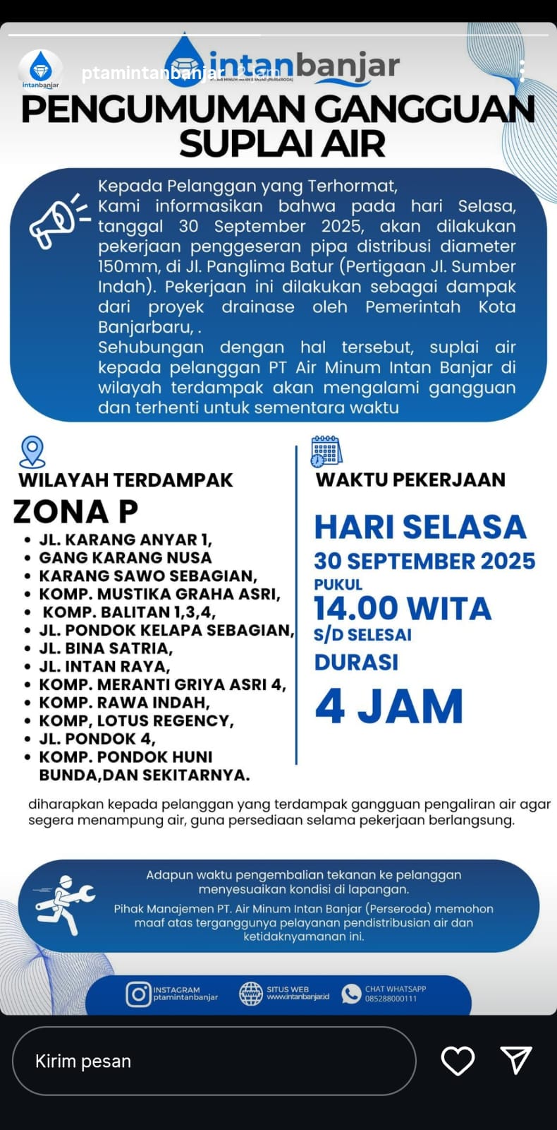 Suratkabardigital.com – PTAM Intan Banjarbaru melakukan pergeseran pipa berdiameter 150mm di Kawasan Jalan Panglima Batur, Banjarbaru, Selasa (30/9/2025). Hal itu dilakukan akibat proyek pengerjaan drainase yang dilaksanakan Pemerintah Kota banjarbaru. Pemberitahuan ini juga disebarkan melalui akun sosial media PTAM Intan Banjar agar diketahui para pelanggan dan masyarakat. Estimasi penggeseran pipa tersebut berlangsung lebih kurang empat jam. Sementara untuk pengembalian tekanan air ke pelanggan menyesuaikan kondisi di lapangan. Akibat proses tersebut, sejumlah titik distribusi air mengalami gangguan suplai air bersih ke pelanggan, yaitu terhentinya aliran air dalam waktu selama proses pengerjaan…